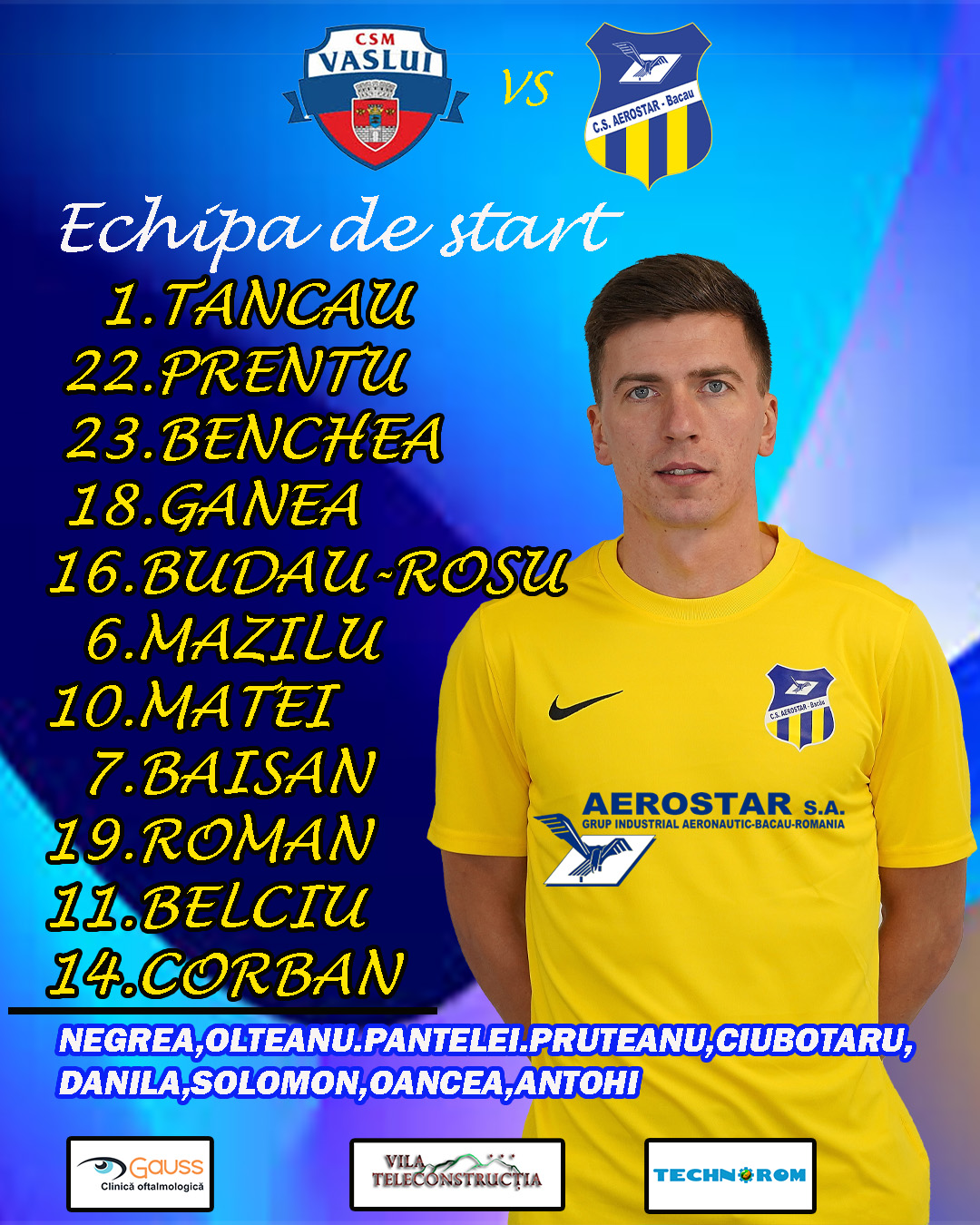 În această partidă, Aerostar a folosit trei juniori proveniți din propria pepinieră: Andrei Solomon (n. 2009) și Teodor Roman (n. 2009), de la echipa U19 pregătită de Gianii Florian, precum și Ciubotaru Darius, de la formația U16, antrenată de Radu Sascău”, scria Aerostar după jocul contra FC Bacău 2.