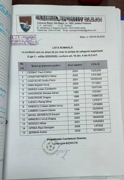Acuzații de fals la CS Blejoi: ”alba-negra” cu lista comună a jucătorilor! Președintele care are semnătura pe acte se apără: ”Au încurcat fișele în geantă”