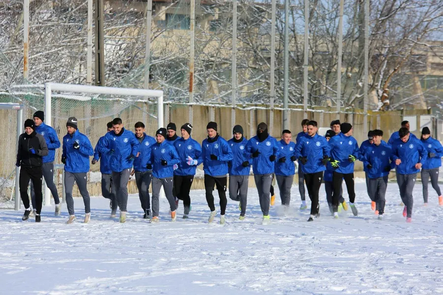 Antrenament în zăpadă pentru CSM Slatina, la reunire. Claudiu Niculescu a avut sub comandă 26 de fotbaliști, dar anunță achiziții: ”Doi jucători”
