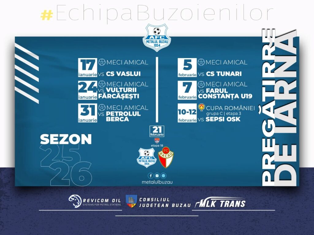 Metalul Buzău a stabilit, în linii mari, adversarele din perioada de iarnă, cinci la număr. Cu toate acestea, există posibilitatea ca Valentin Stan să mai programeze câteva teste, în funcție de disponibilitatea anumitor echipe.