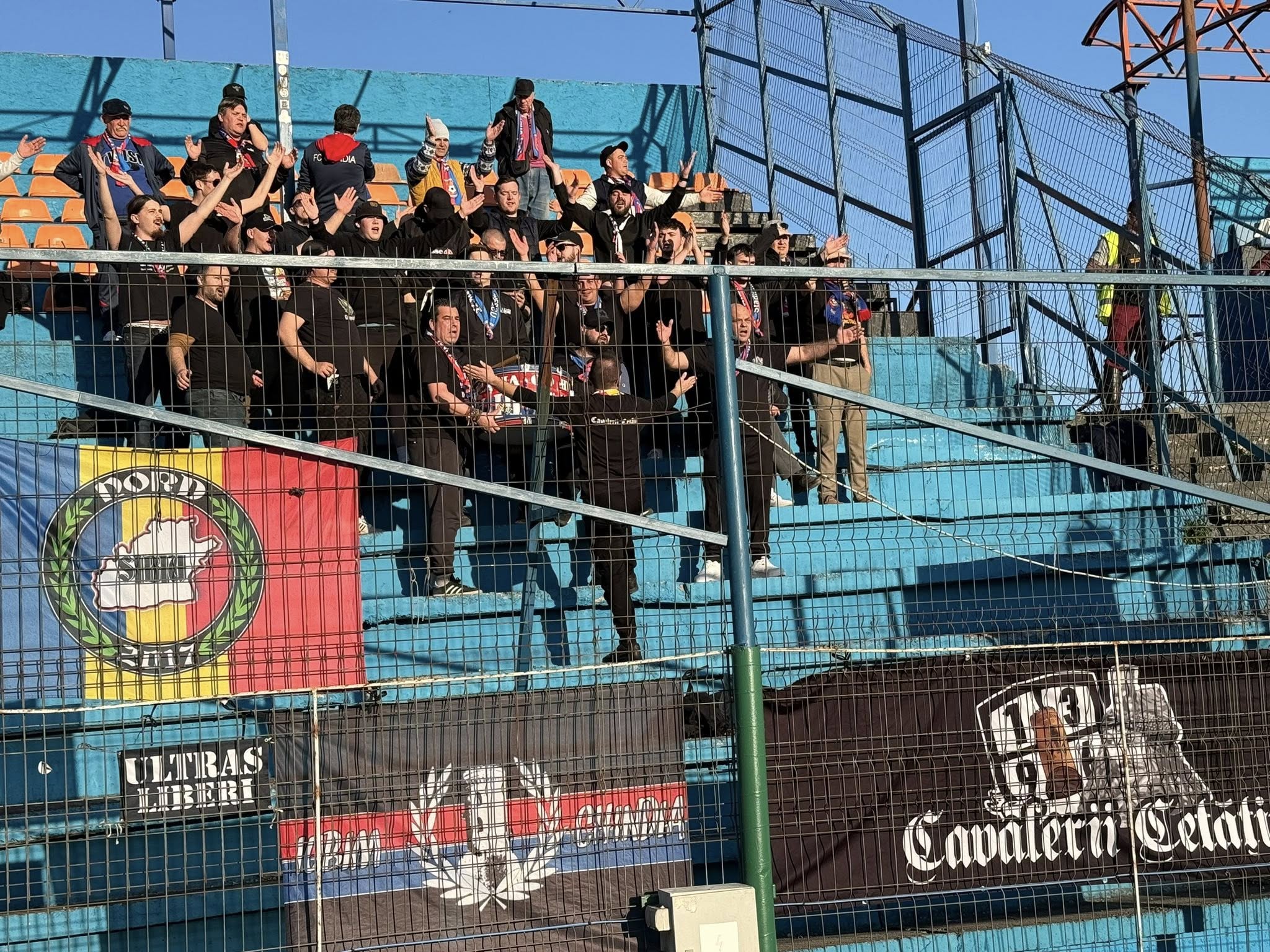 În sectorul rezervat oaspeților au fost 25 de fani de la Târgoviște, cărora li s-au adăugat 10 suporteri sibieni, înfrățiți cu grupul Cavalerii Cetății.