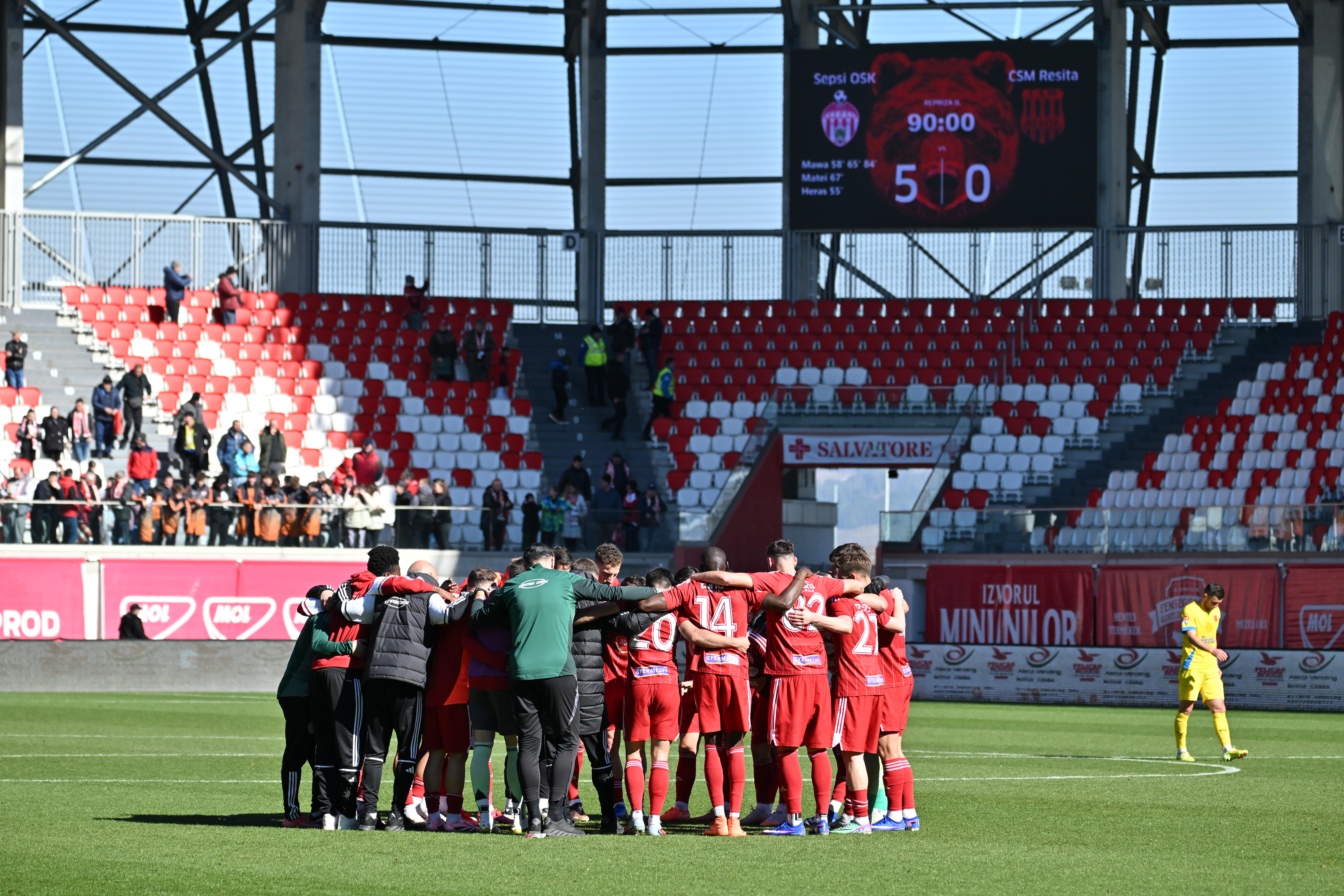 În zece, Reșița s-a prăbușit, iar Sepsi OSK a marcat la foc automat. Primele sale patru goluri u venit după faze de contraatac! Au mai înscris Moses Mawa (65 și 83) și Cosmin Matei (67).